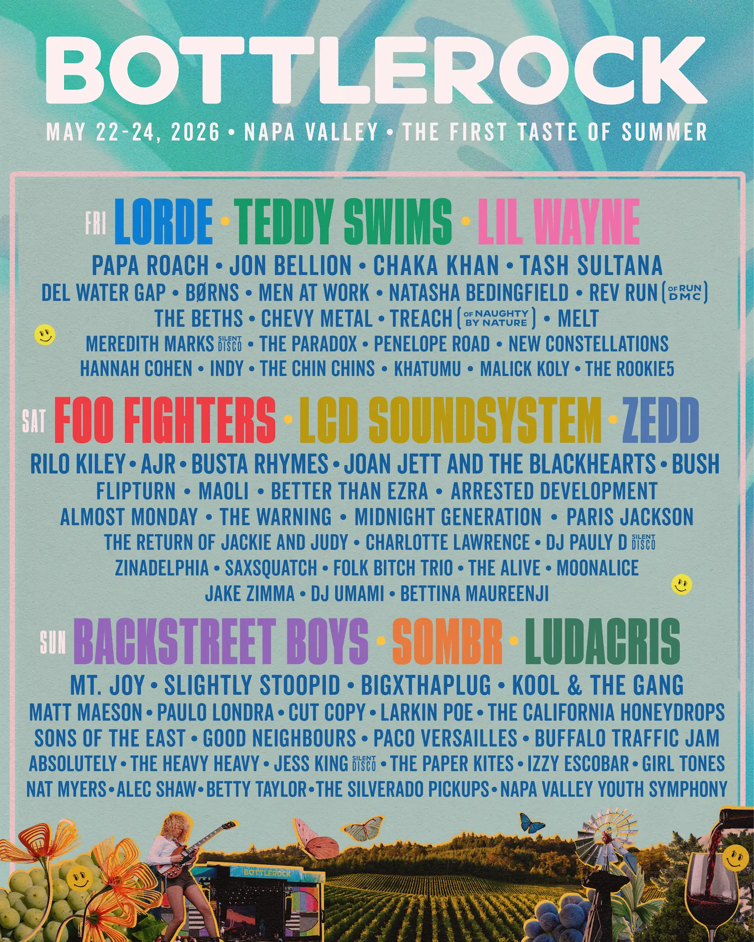 Lorde·Teddy Swims·Lil Wayne·Foo Fighters·LCD Soundsystem·Zedd·Backstreet Boys·Somos·Ludacris·Papa Roach·Jon Bellion·Chaka Khan·Tash Sultana·Del Water Gap·BØRNS·Men at Work·Natasha Bedingfield·REV RUN·The Beths·Chevy Metal·Treach·Meredith Marks·The Paradox·Penelope Road·New Constellations·Hannah Cohen·Hwy·The Chin Chin·Kantomu·Malick Koly·The Rookies·Rilo Kiley·AJR·Busta Rhymes·Joan Jett and the Blackhearts·Bush·Fliptown·Better Than Ezra·Arrested Development·Almost Monday·The Warning·Midnight Generation·Paris Jackson·The Return of Jackie and Judy·Dr. Paulo DJ·Znadelphia·Sassquatch·Folk Ditch Trio·The Alfie·Moonalice·Jake Zimma·DJ Umami·Bettina Mauerseig·Mt. Joy·Slightly Stoopid·Biggxthaplug·Kool & the Gang·Matt Mason·Paulo Londra·Cut Copy·Larkin Poe·The California Honeydrops·Sons of the East·Good Neighbors·Paco Versailles·Buffalo Traffic Jam·Absolutley·The Heavy Heavy·Jess King·The Paper Kites·Izzy Escobar·Girl Tones·Nat Myers·Alec Gran·Betty Taylor·The Silverado Pickups·Napa Valley Youth Symphony
