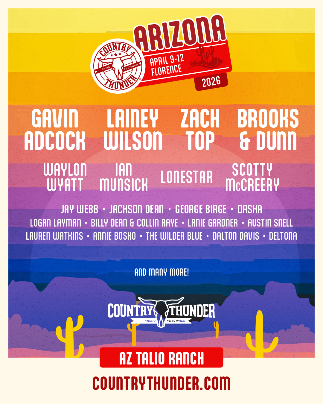 Four days of country music and camping in the Arizona desert. Headliners include Lainey Wilson, Brooks & Dunn, Gavin Adcock, and Zach Top, plus Ian Munsick, Scotty McCreery, and dozens more.