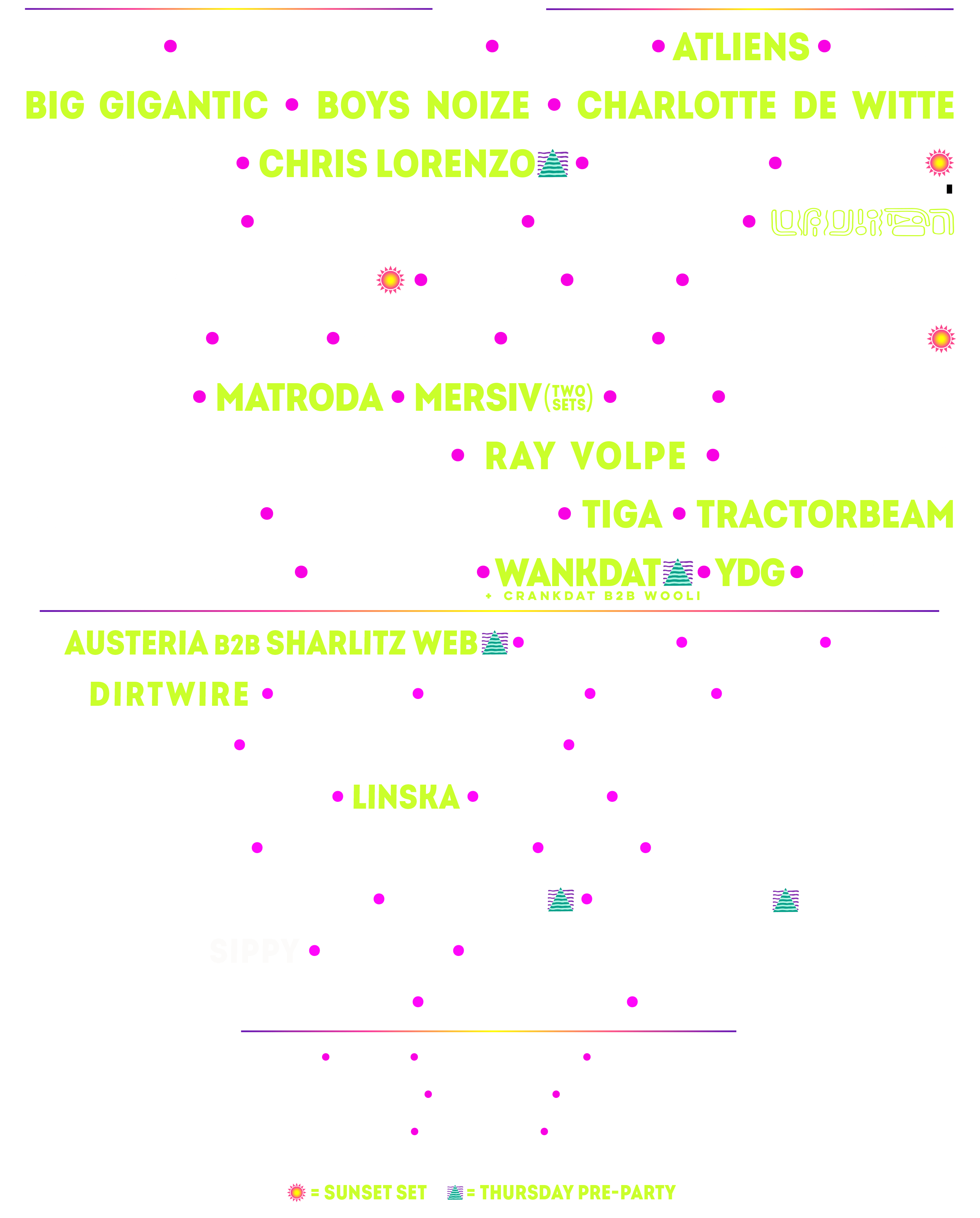 A-Trak·Above & Beyond·Acraze·Atliens·AYYBO·Big Gigantic·Boys Noize·Charlotte de Witte·Chris Lake·Chris Lorenzo·Cloonee·CloZee·Crankdat·Daily Bread·Excision·Ganja White Night·Hedex·Holi·I Hate Models·Jigitz·Kettama·Level Up·Louis the Child·Lsdream·Matroda·Mersiv·MPH·Of the Trees·Porter Robinson·Ray Volpe·Sub Focus·Subtronics·Svdden Death·Tiga·Tractorbeam·Walker & Royce·Westend·YDG·Zingara·IVY Lab·Jackie Hollander·Kaleena Zanders·Marvel Years·Probcause·San Pacho·Sippy·Skysia·Will Clarke·X Club·Dirtwire·Effin·Azzecca·Biscits·Thought Process·Roddy Lima·Linska
