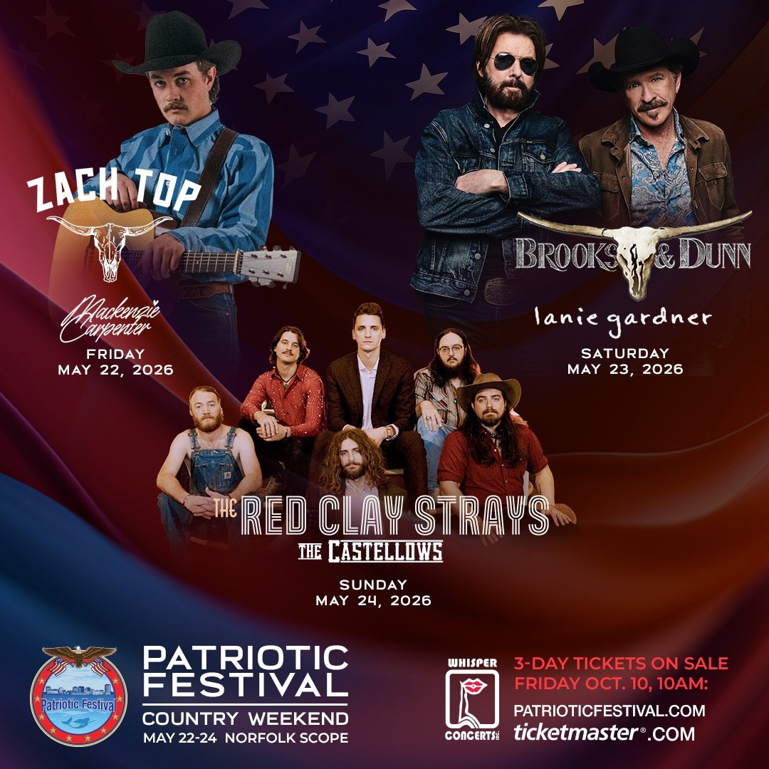 The 22nd annual Patriotic Festival Country Weekend celebrates Memorial Day with three nights of country music headliners at Scope Arena in downtown Norfolk, honoring America's military.